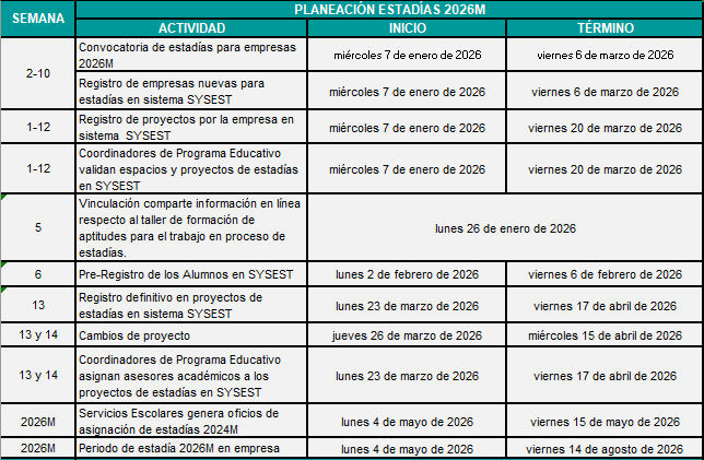 El proceso de Estadía es una práctica académica en la industria, dentro de un Modelo Dual con duración de un cuatrimestre para cada programa educativo en su mapa curricular, realizada en los cuatrimestres 6º para TSU, y 11º para Ingeniería, en la cual se rige por un cronograma académico que se debe cumplir como cualquier asignatura, en el cual se indican las fechas que el alumno tendrá que asistir a la Universidad a revisiones del informe recepcional. Al término de este proceso la empresa deberá, a través del sistema validar el informe individual, evaluar el desempeño del alumno y emitir la constancia de terminación de la estadía en el formato previsto en el sistema.